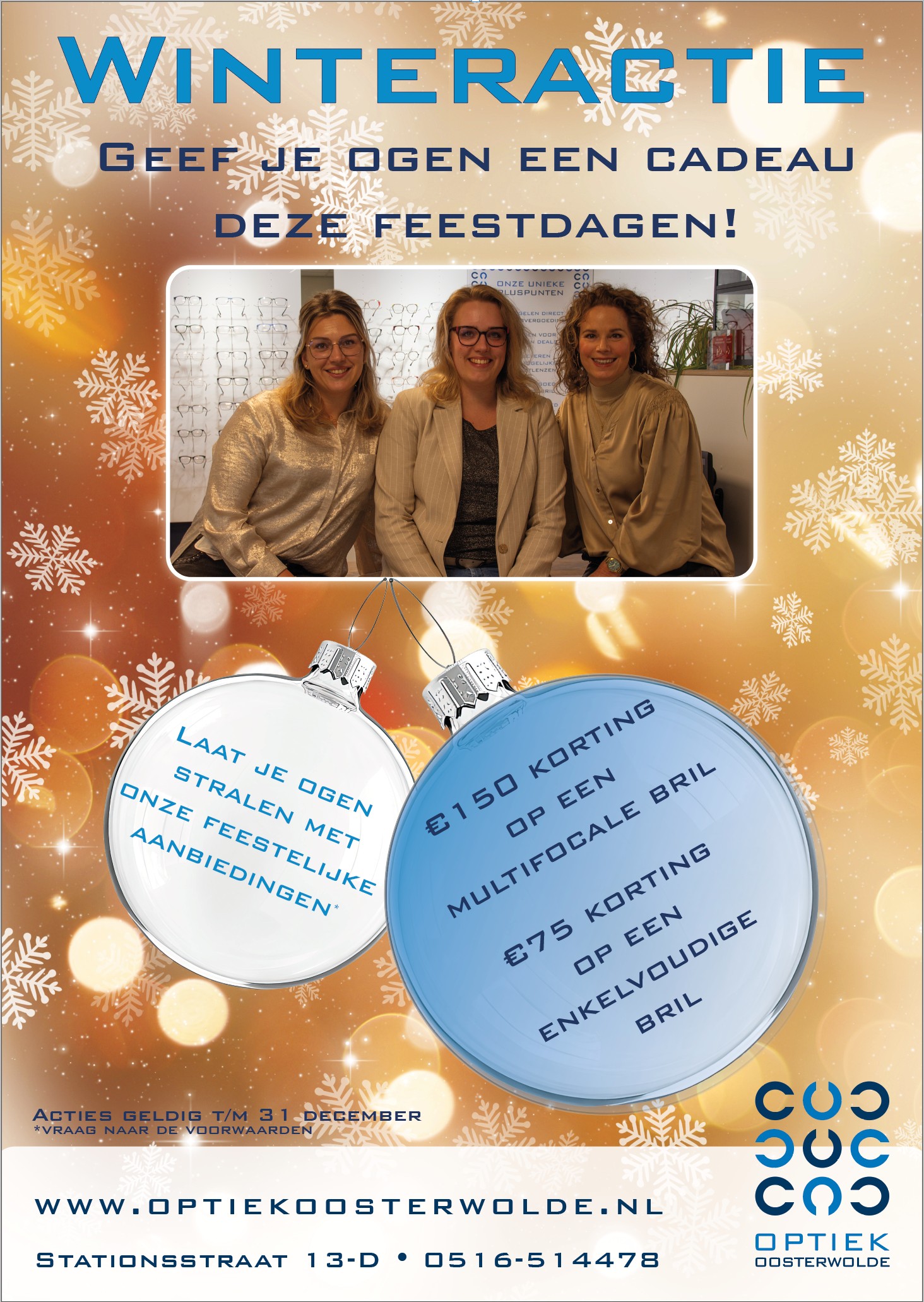 Bij Optiek Oosterwolde hebben we een winteractie. U ontvangt bij aankoop van een complete multifocale bril €150,- korting en bij aankoop van een complete enkelvoudige bril €75,- korting.